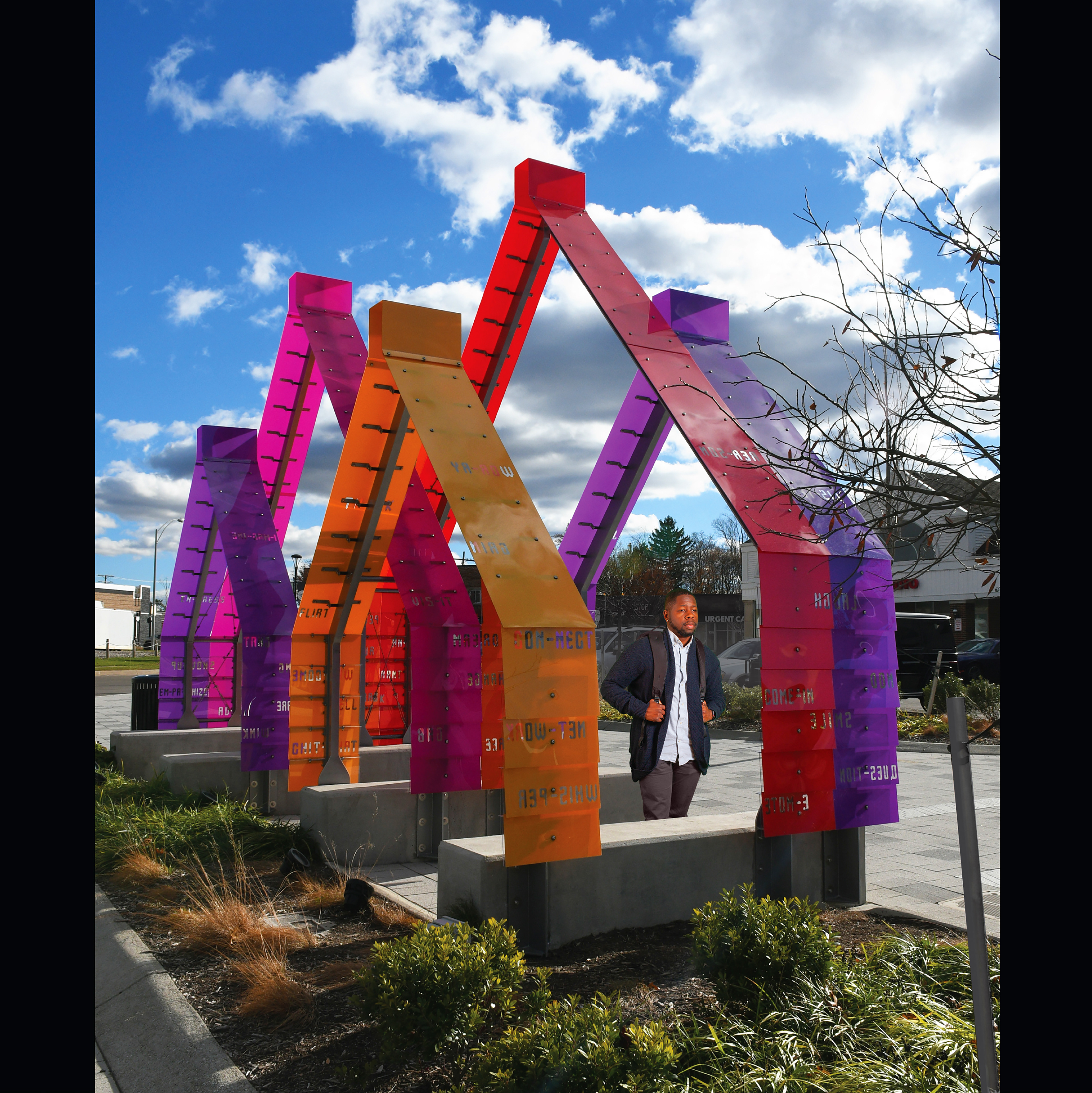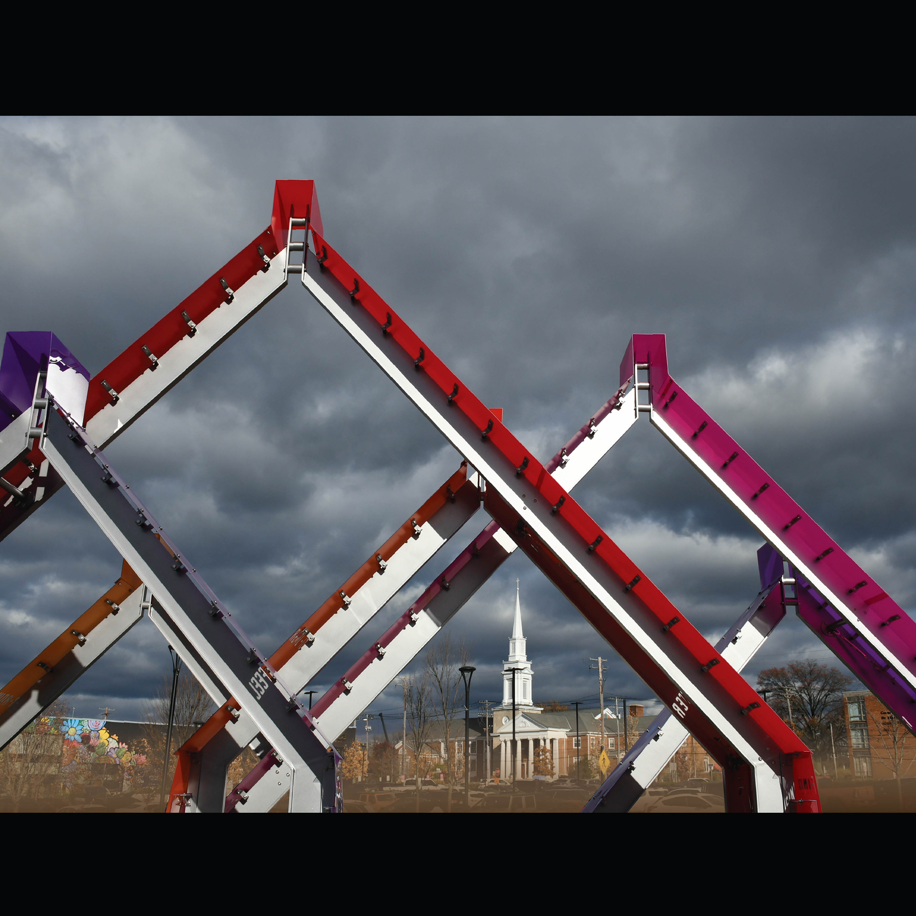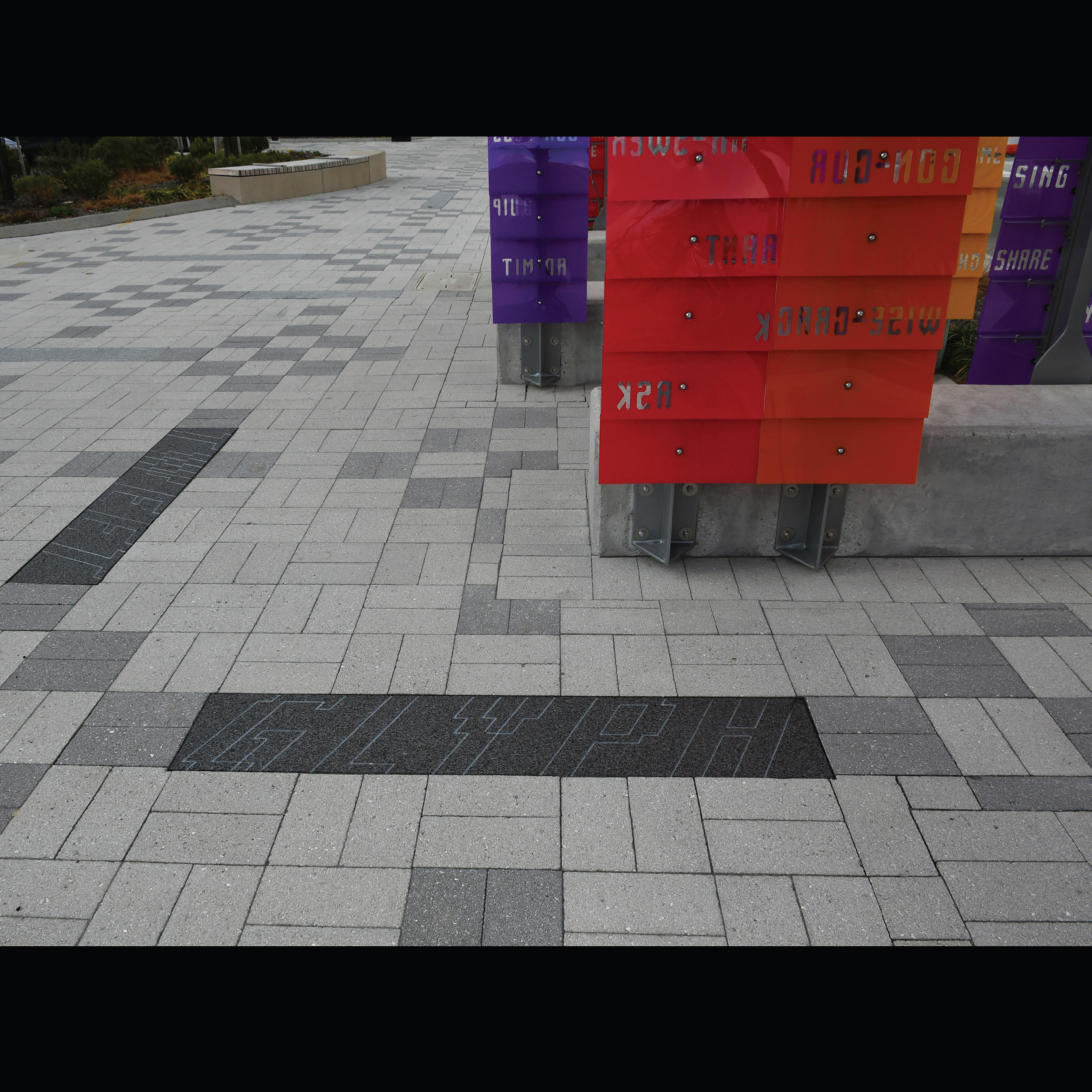 These symbolic roofed structures overhead signal individual’s societal roles. The peaked forms suggest an associative range from personal/ residential to civic/ institutional. The communal spaces within facilitate engagement, interaction, or dialogue. The sitework provides a metaphoric armature for the community’s content – diverse identities, histories, and dynamics. At this crossroads of societal transience via bicycle, bus, train, or automobile, this structure evokes a symbolic village, invites inhabitation, and sparks face-to-face conversations and interactions via prompts that are inscribed on the vertical and overhead surfaces – Express, Joke, Disagree, Flirt, Laugh, Confide, etc. Inscribed granite stones inset into the plaza suggest the final resting place of indirect communication technologies– Telegram, Postcard, Tweet, Smoke Signal, Letter, etc. – that have supplanted direct human interactions over decades and centuries, eventually becoming obsolete.