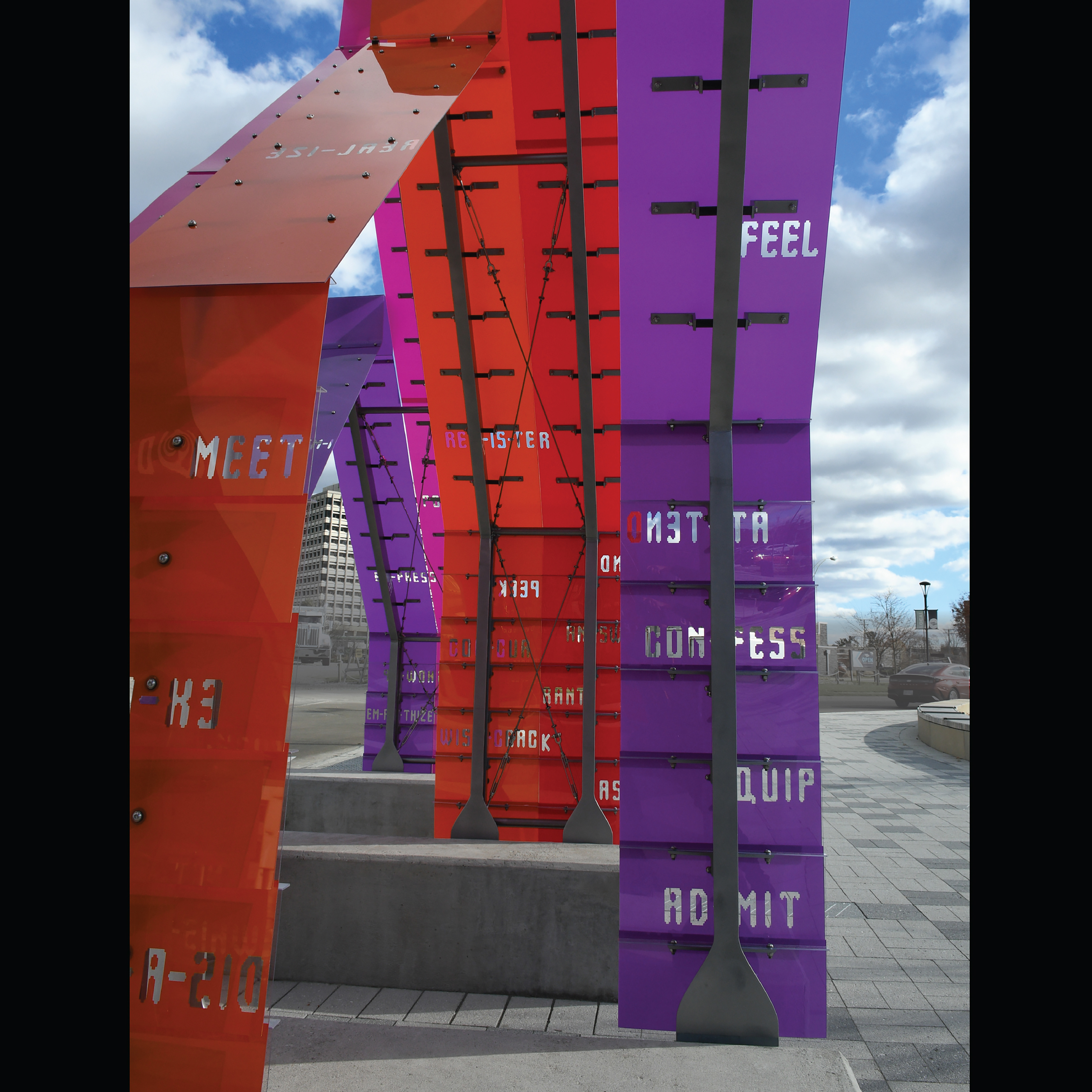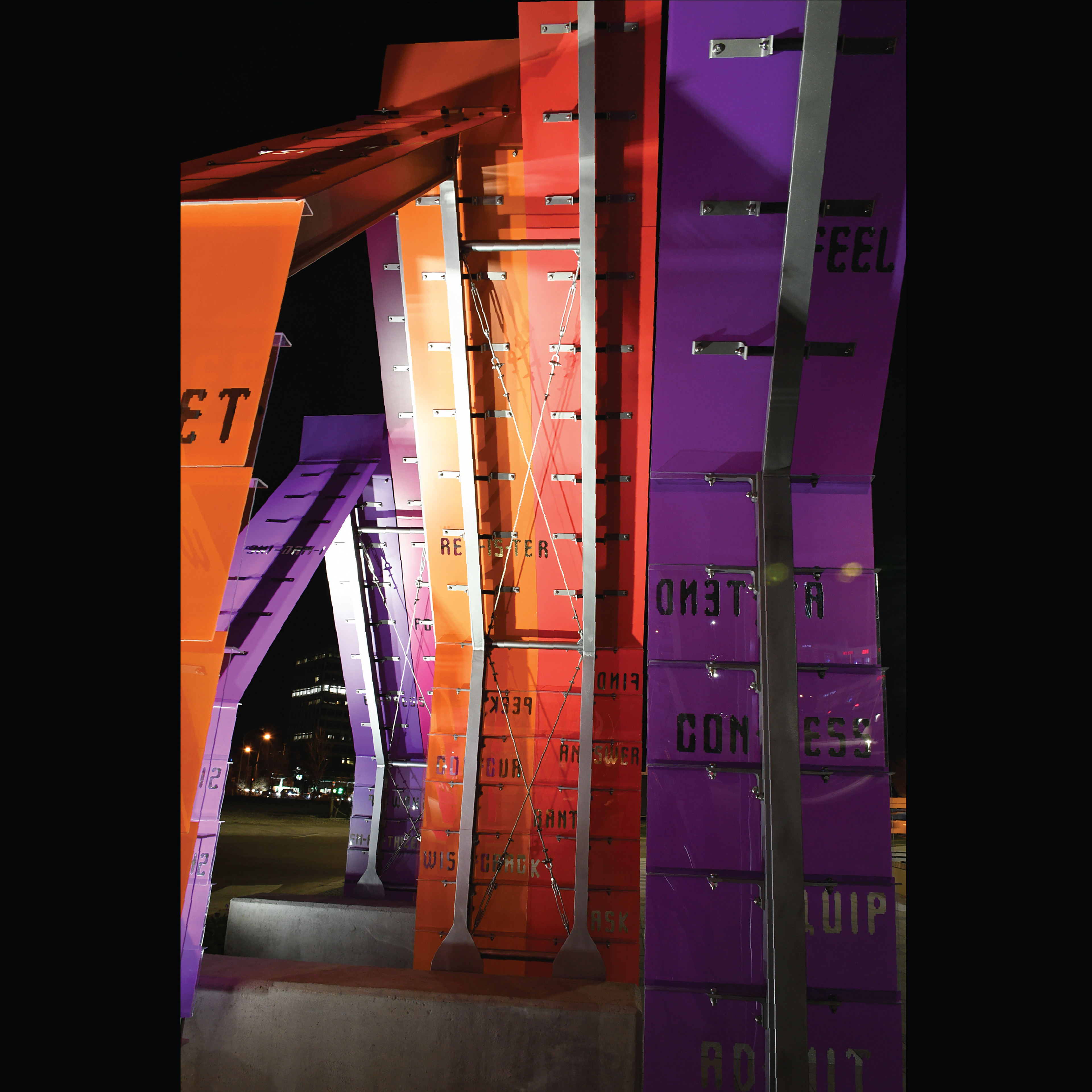 Constructed of concrete, structural steel, aluminum, polycarbonate with die-cut inscriptions, external illumination.